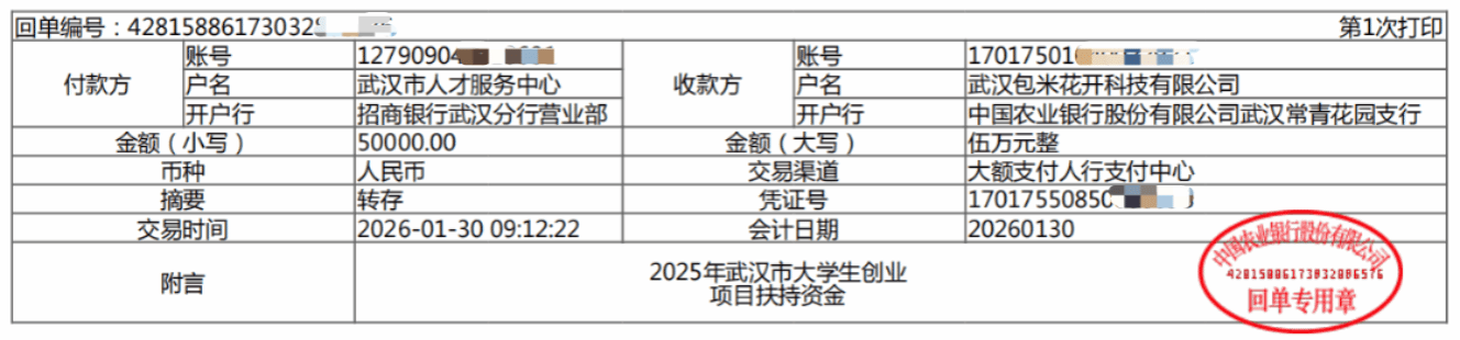 近日,2025年武汉市大学生创业项目扶持资金正式拨付。我校机械工程学院包装工程专业学生创办的"武汉包米花开科技有限公司",在首次申报中便成功获批5万元市级扶持资金。