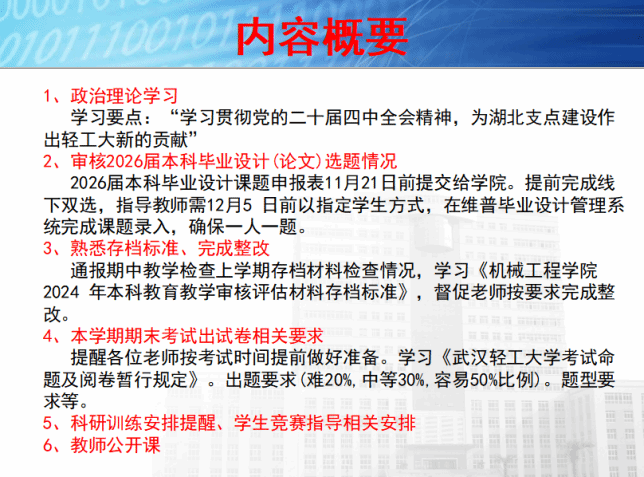 会议伊始,全体与会教师进行了政治理论学习,聚焦“学习贯彻党的二十届四中全会精神,为湖北支点建设作出轻工大新的贡献”。随后,尹强主任就2026届本科毕业设计(论文)选题工作作出具体安排,提醒各位教师及时完成线下双选及课题系统录入,并强调需熟悉毕业设计存档规范、按时完成相关整改工作。此外,他还对本学期期末考试命题、科研训练安排以及学生竞赛指导等事项作了进一步提醒与部署。